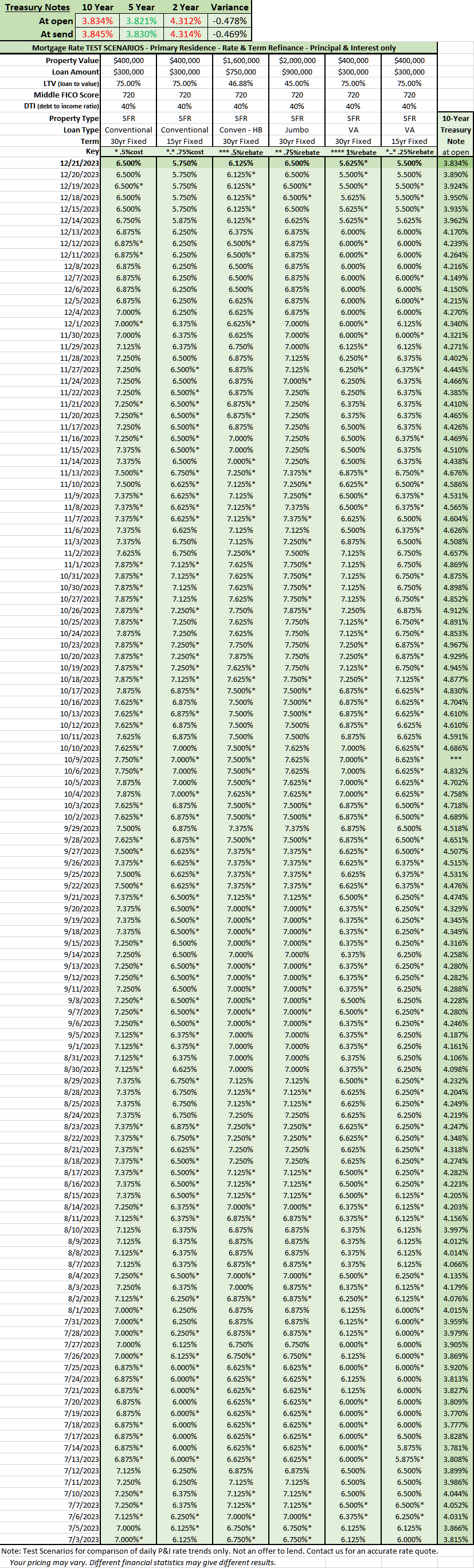 To receive daily rate updates, akin to the example below, displaying rates from February 2020 up to the present, please reach out to us via email at info@ilovemylender.com.